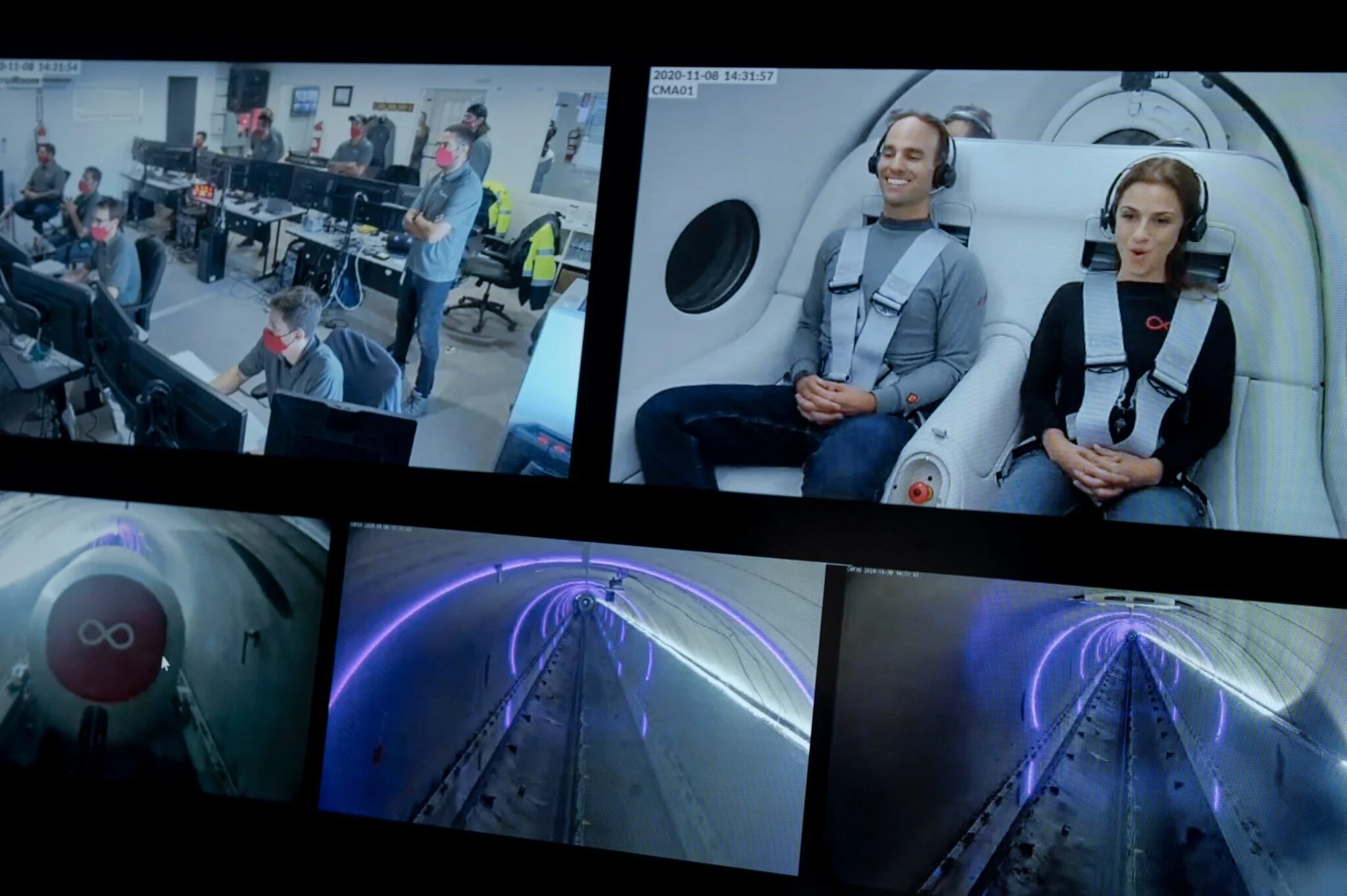 Josh Giegel and Sara Luchian as their hyperloop pod accelerated on Sunday in the desert north of Las Vegas. They reached 107 m.p.h. in just over six seconds.